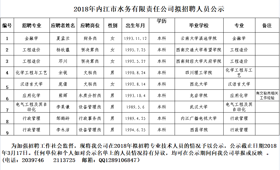 2018年內(nèi)江市水務(wù)有限責(zé)任公司擬招聘人員公示