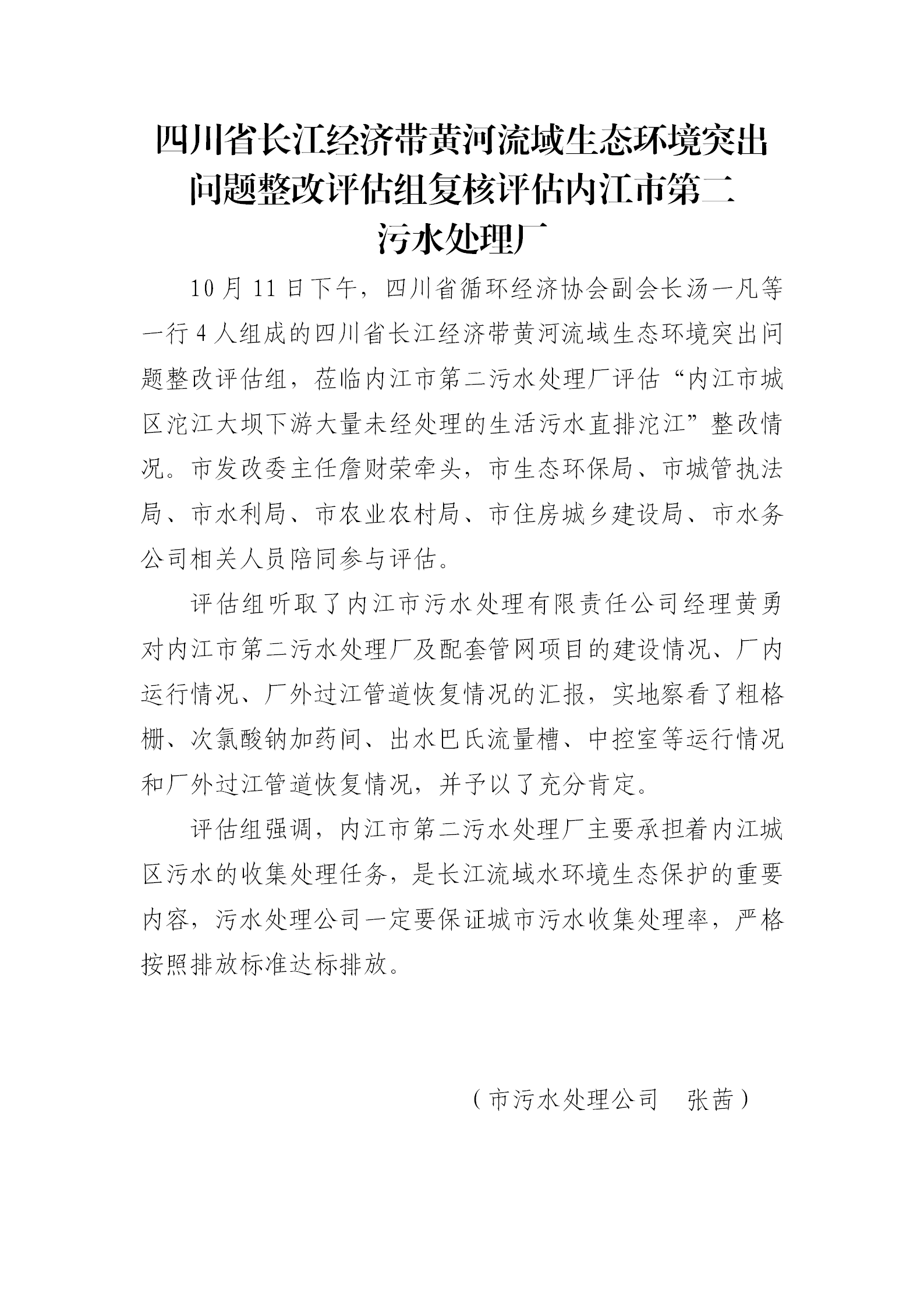 四川省長(zhǎng)江經(jīng)濟(jì)帶黃河流域生態(tài)環(huán)境突出問(wèn)題整改評(píng)估組復(fù)核評(píng)估內(nèi)江市第二 污水處理廠