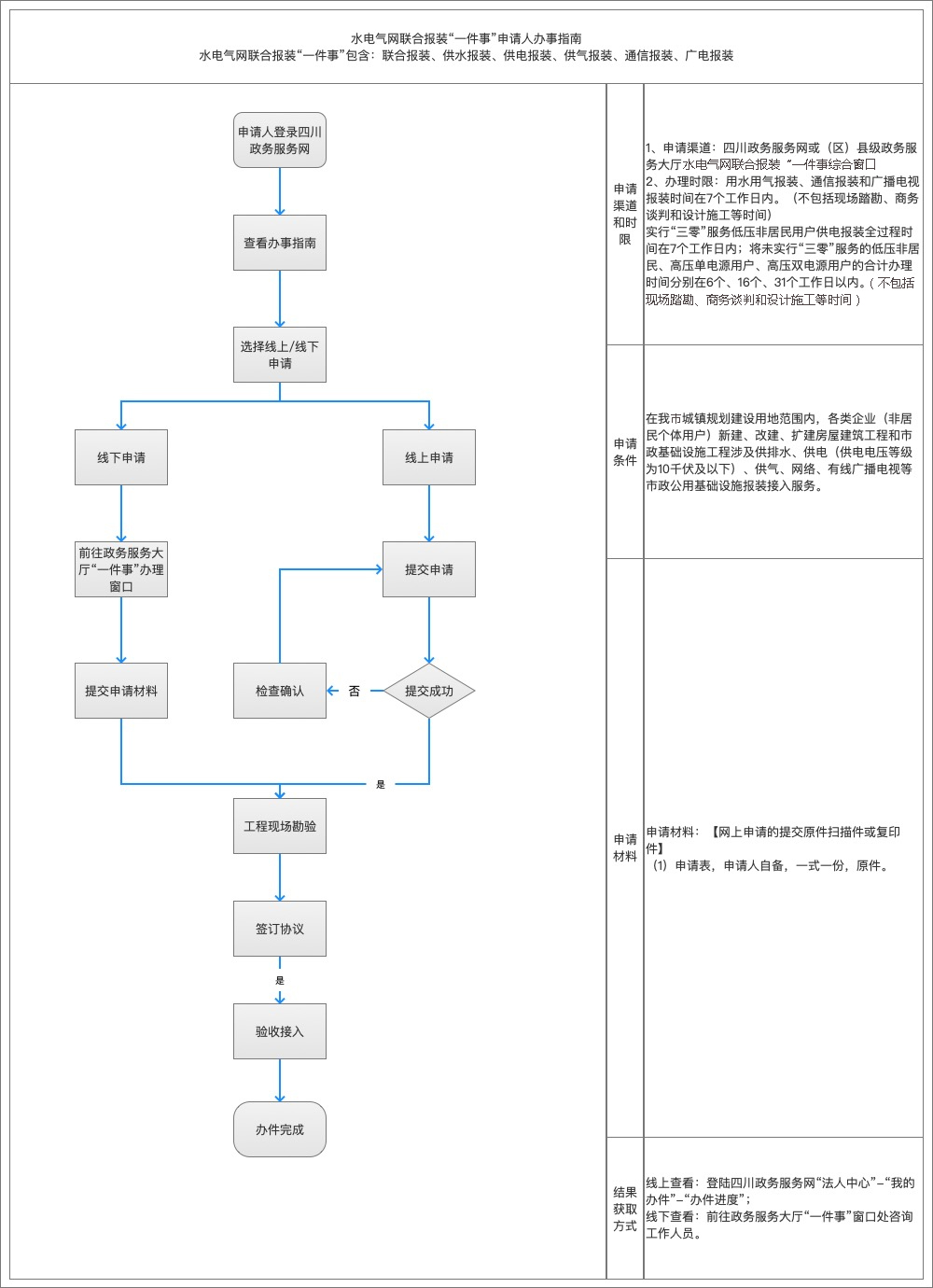 (一)網上申請:申請人登錄四川政務服務網平臺,點擊工程建設項目審批專欄,選擇具體報裝辦理事項,提交申請,上傳申請材料。