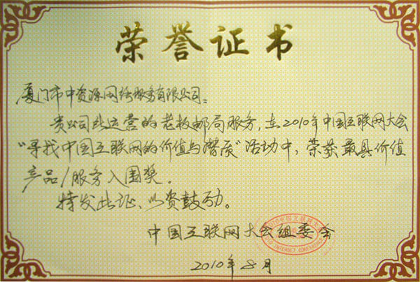 2010互聯(lián)網(wǎng)大會(huì)最具價(jià)值產(chǎn)品/服務(wù) 入圍獎(jiǎng)榮譽(yù)證書