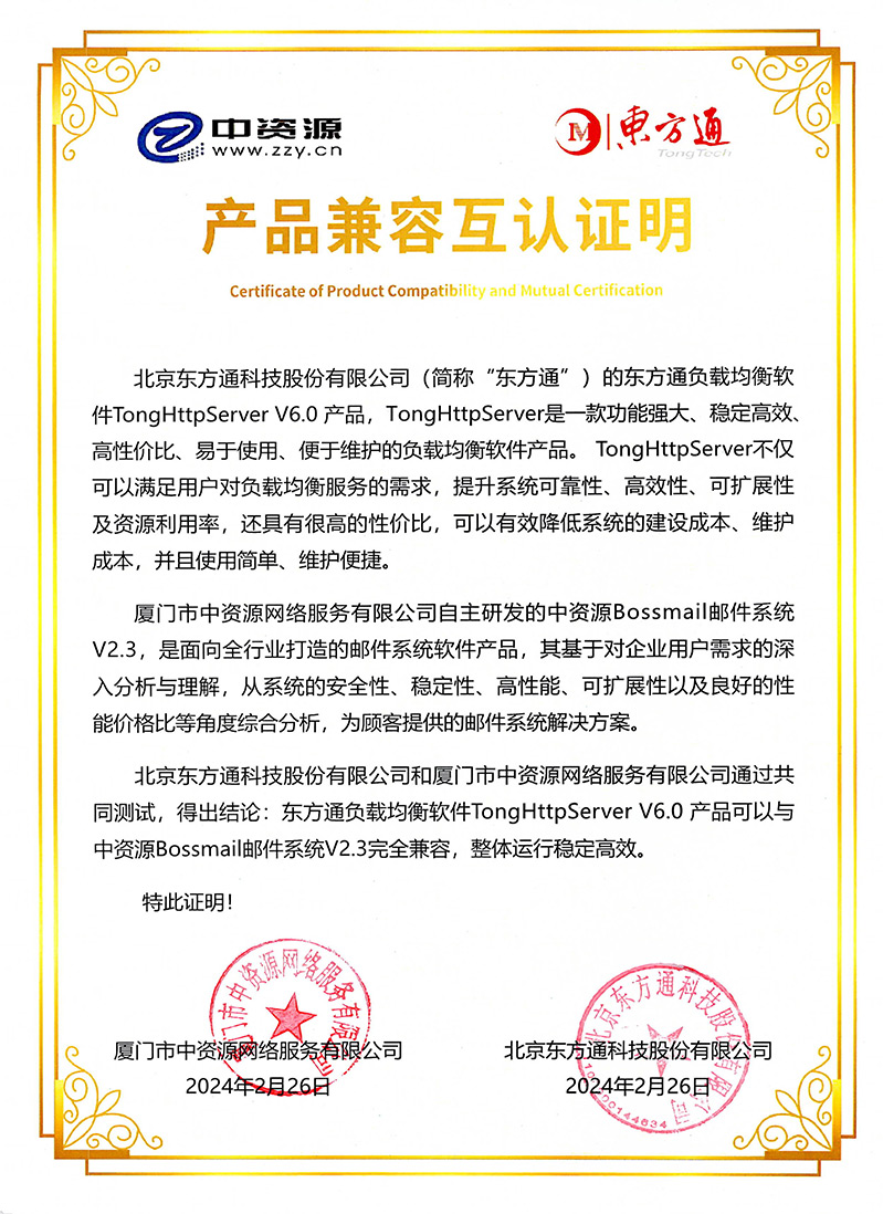 【國產(chǎn)化】東方通產(chǎn)品兼容互認(rèn)證證明